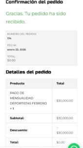 Agradecemos a todos los deportistas y padres de familia realizar el procedimiento de manera correcta y de esta manera llevar un control adecuado de los ingresos. Si necesitan soporte para el mismo pueden presionar sobre el boton verde de Whatsapp que se encuentra en la parte inferior derecha de la pantalla.